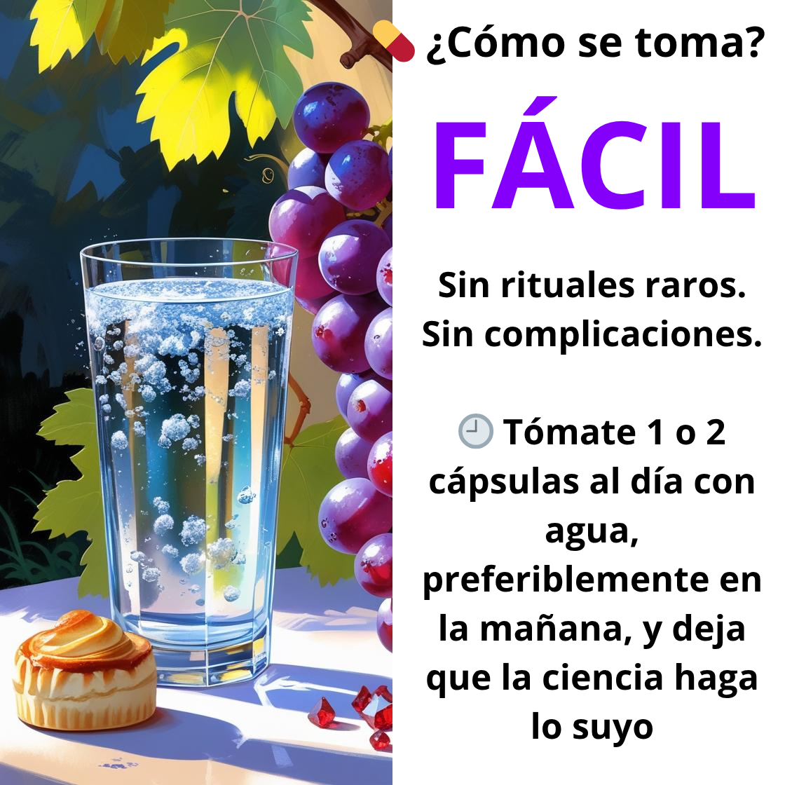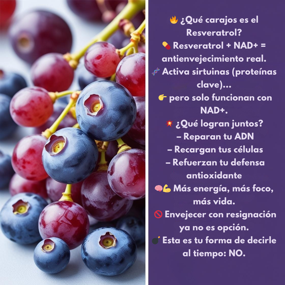 - 🍇 Apoyo al Antienvejecimiento: Estimula procesos de reparación celular y longevidad.